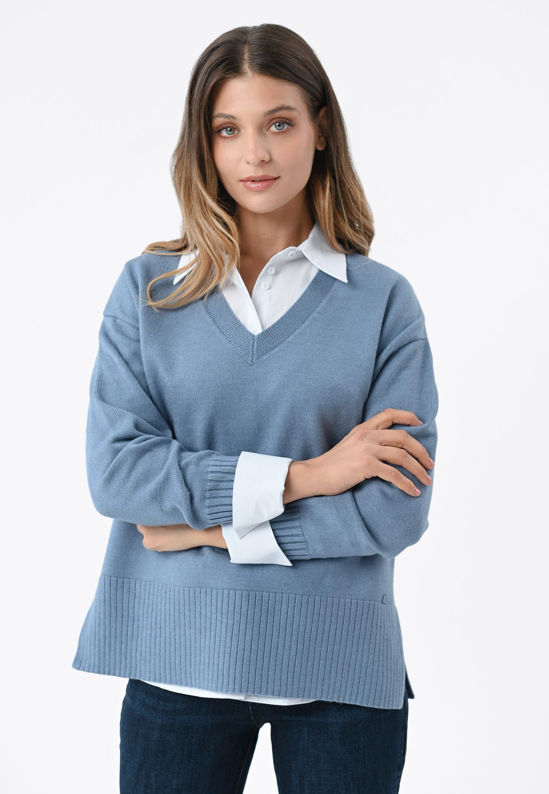 - Cechy produktu: miękki, miły w dotyku materiał krój Comfort Fit dekolt w serek obniżona linia ramion na dole luźny, szeroki i prążkowany ściągacz rękawy wykończone szerokim, prążkowanym ściągaczem dwa rozcięcia po bokach detal Volcano Luźny sweter z dekoltem w serek Co wyróżnia niebieski sweter S-NOVA to luźny, swobodny fason i dekolt w serek