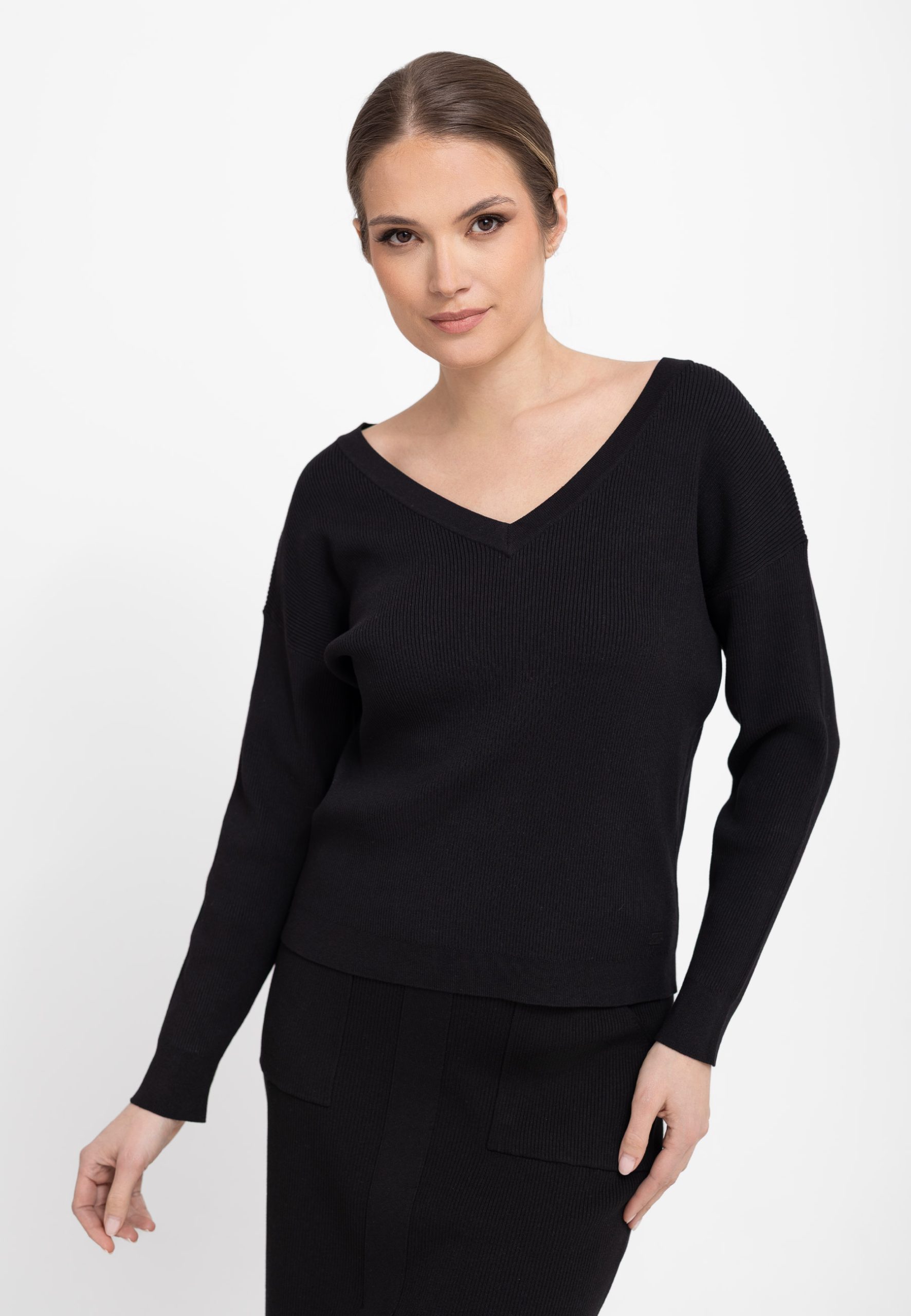 Czarny, prążkowany sweter z dekoltem S-TIKA