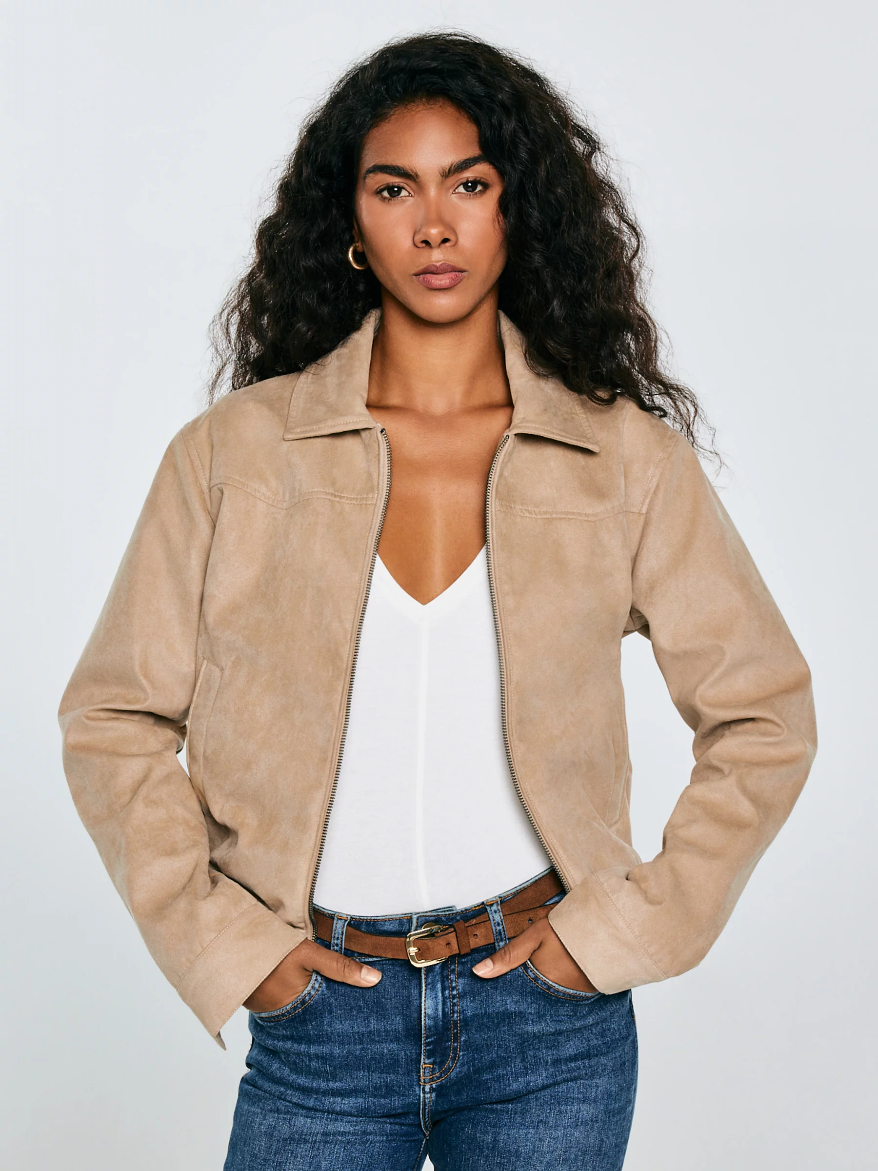 • Sylowa, krótka kurtka wykonana z miękkiej imitacji zamszu, która łączy elegancję z codzienną wygodą