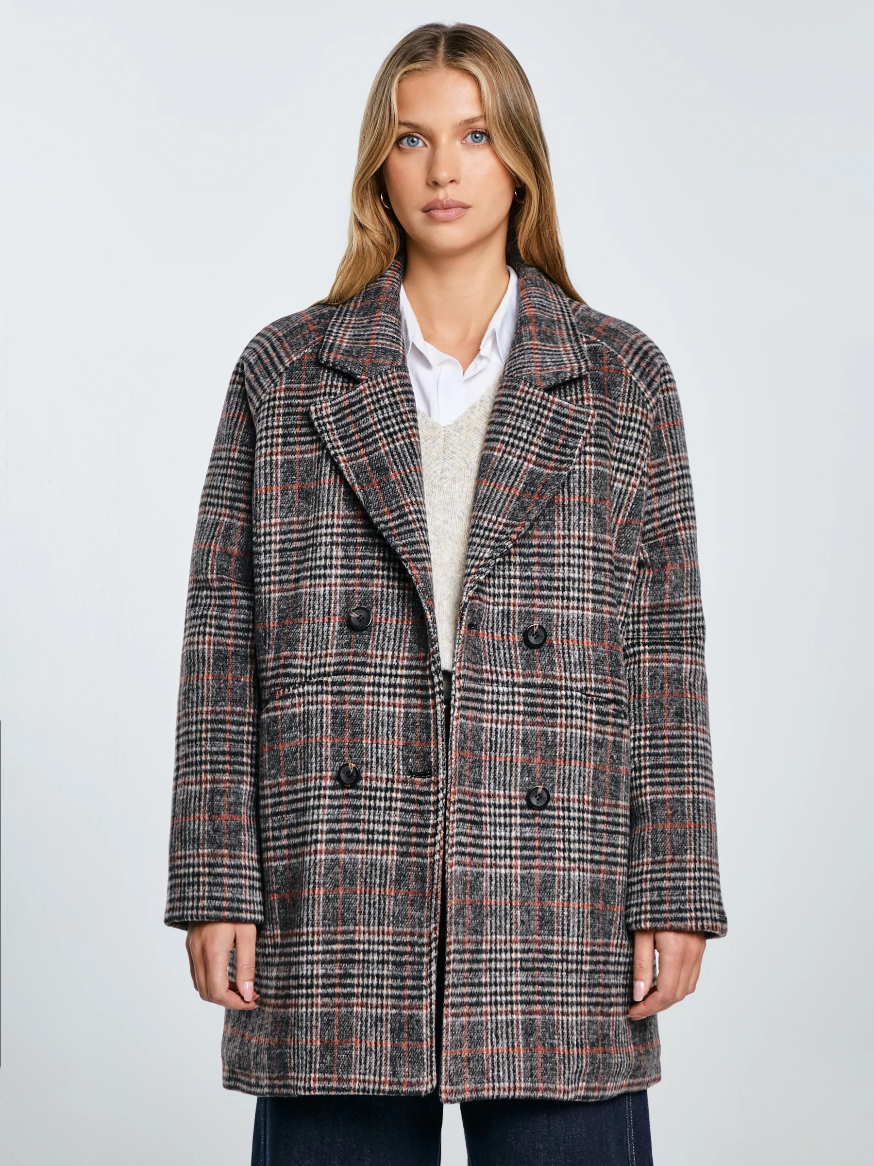 Wyjątkowy i nietuzinkowy Wielokolorowy Płaszcz damski z dodatkiem wełny kratę szary Ariela 000.