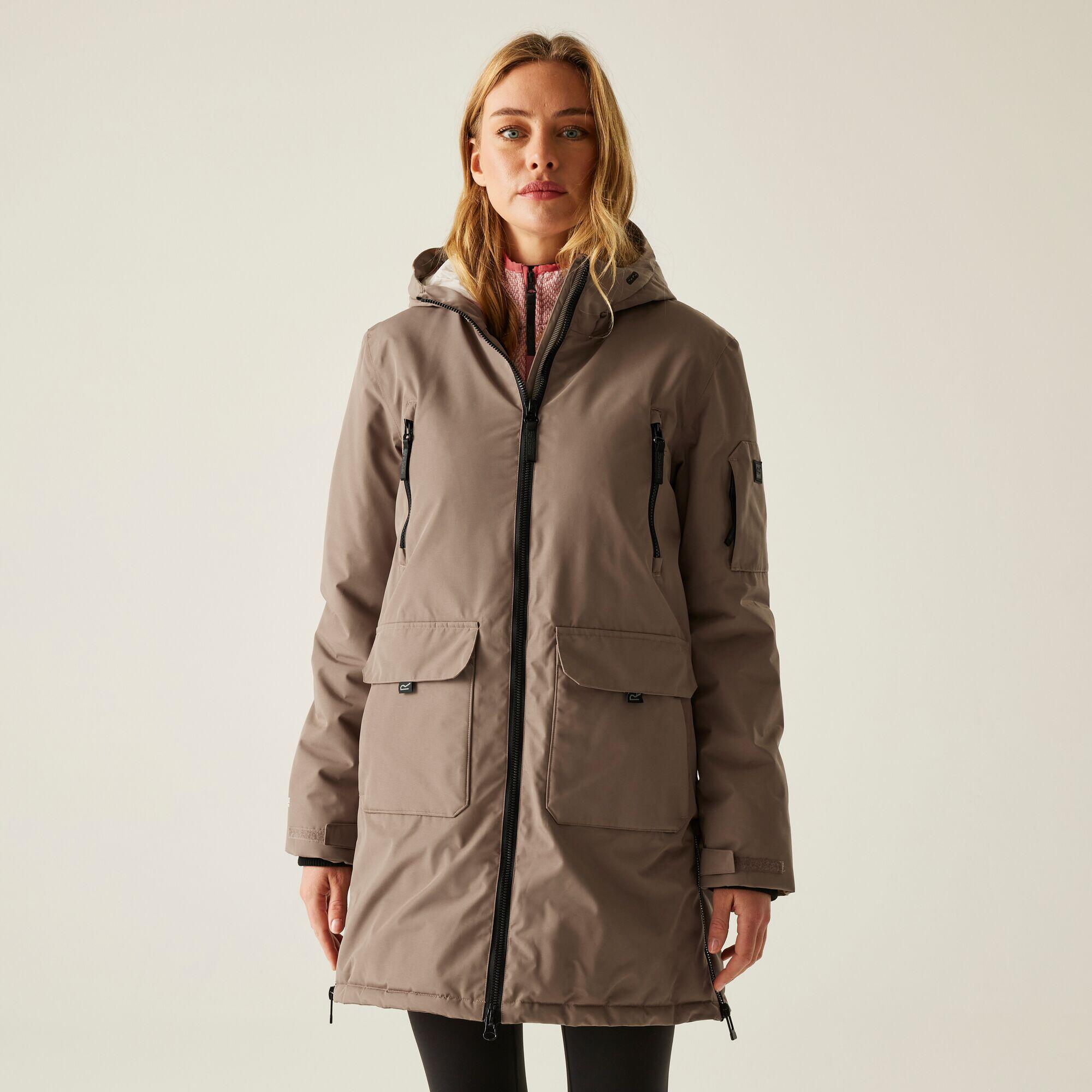 Wyjątkowy i nietuzinkowy Brązowy Płaszcz damski zimowy ocieplany przeciwdeszczowy Gwynn.