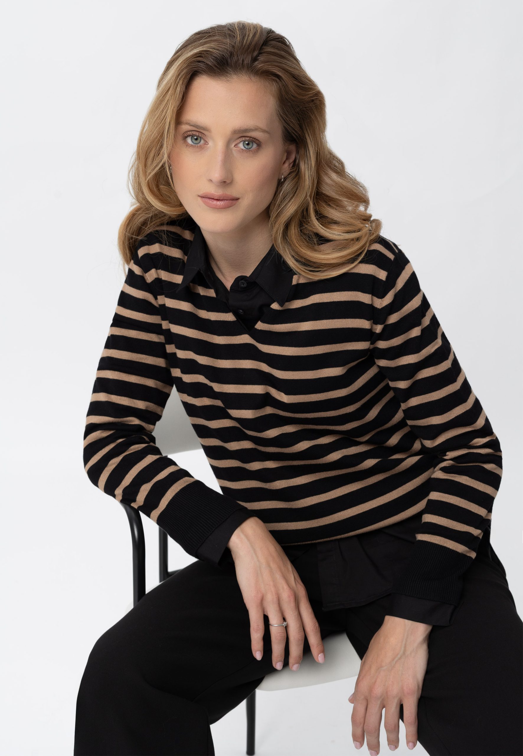 - Sweter damski z dekoltem w serek Sweter w paski z dekoltem v-neck to klasyka, która pozwala połączyć sweter z ulubionym naszyjnikiem lub koszulą i urozmaicić Twoją stylizację! Dół i rękawy zostały wykończone ściągaczami