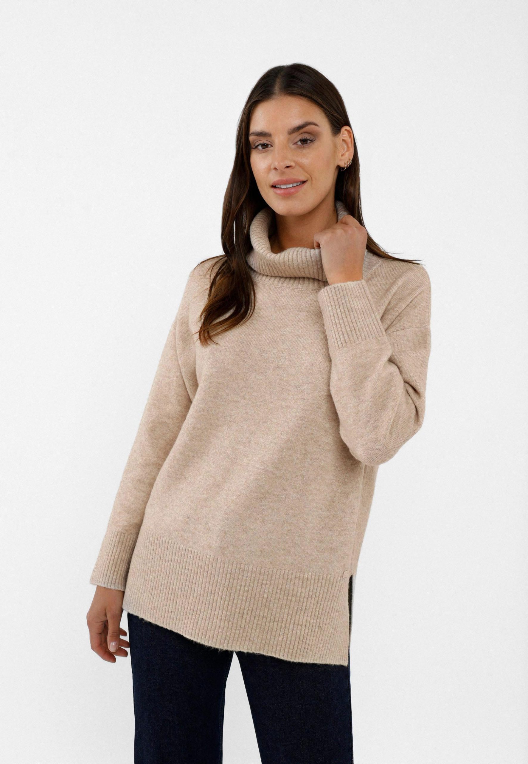 • Ciepły damski golf Beżowy golf S-HEBE o luźnym kroju został wykończony szerokim i luźnym golfem o strukturze ściągacza
