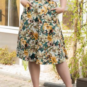 A Spódnica trapezowa z kieszeniami na lato AGUSIA pomarańczowe i koralowe liście palmy na ecru PROMOCJA